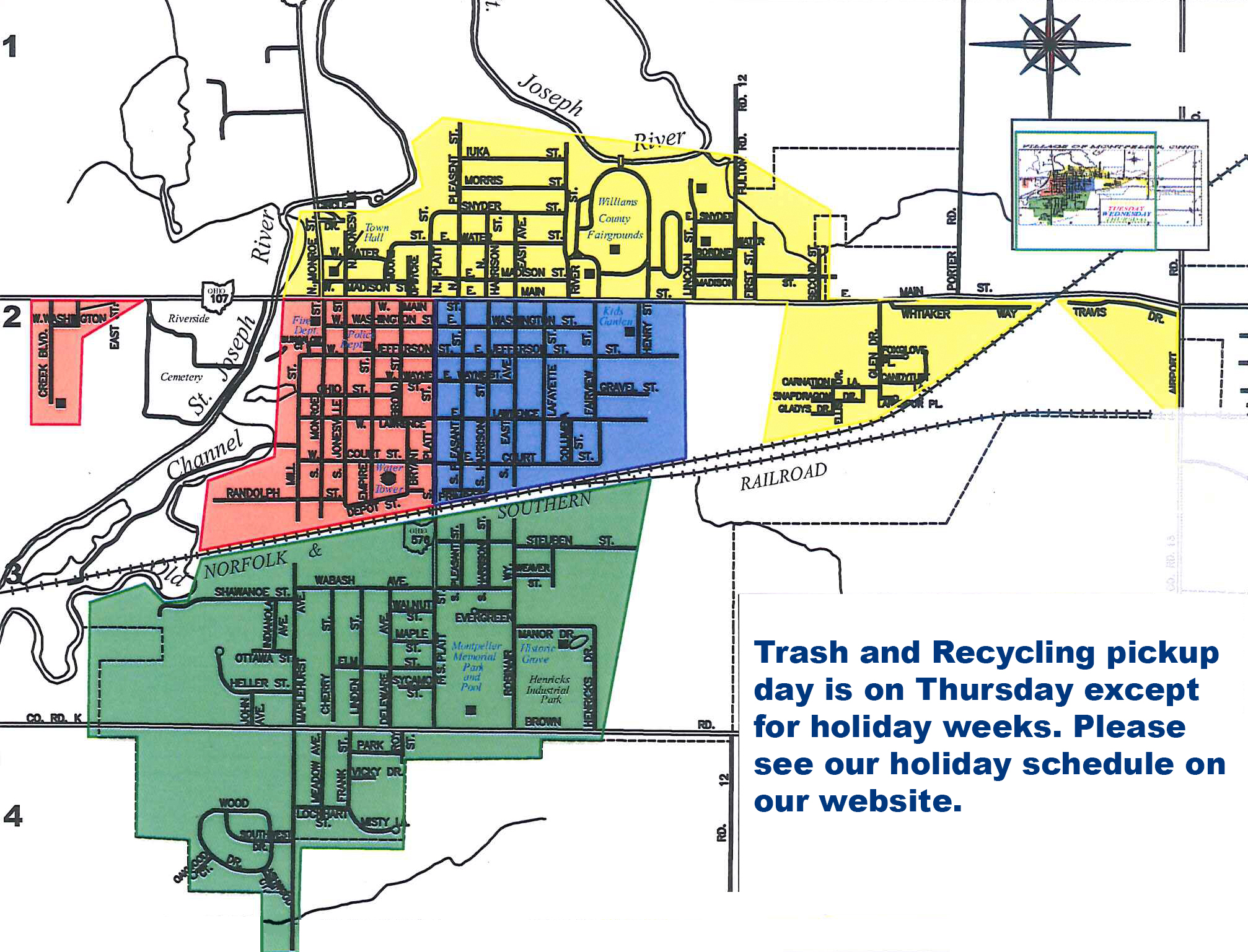 Trash and Recycling pickup day is on Thursday except for holiday weeks.